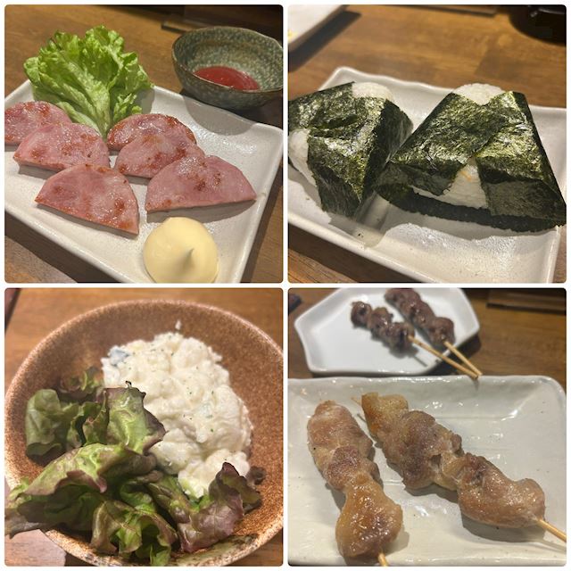 先ずはキンキン冷えたジョッキのビールのトレーニングメニューから始まり、わさびのポテサラ、焼き鳥、明宝ハム、おにぎりetc…