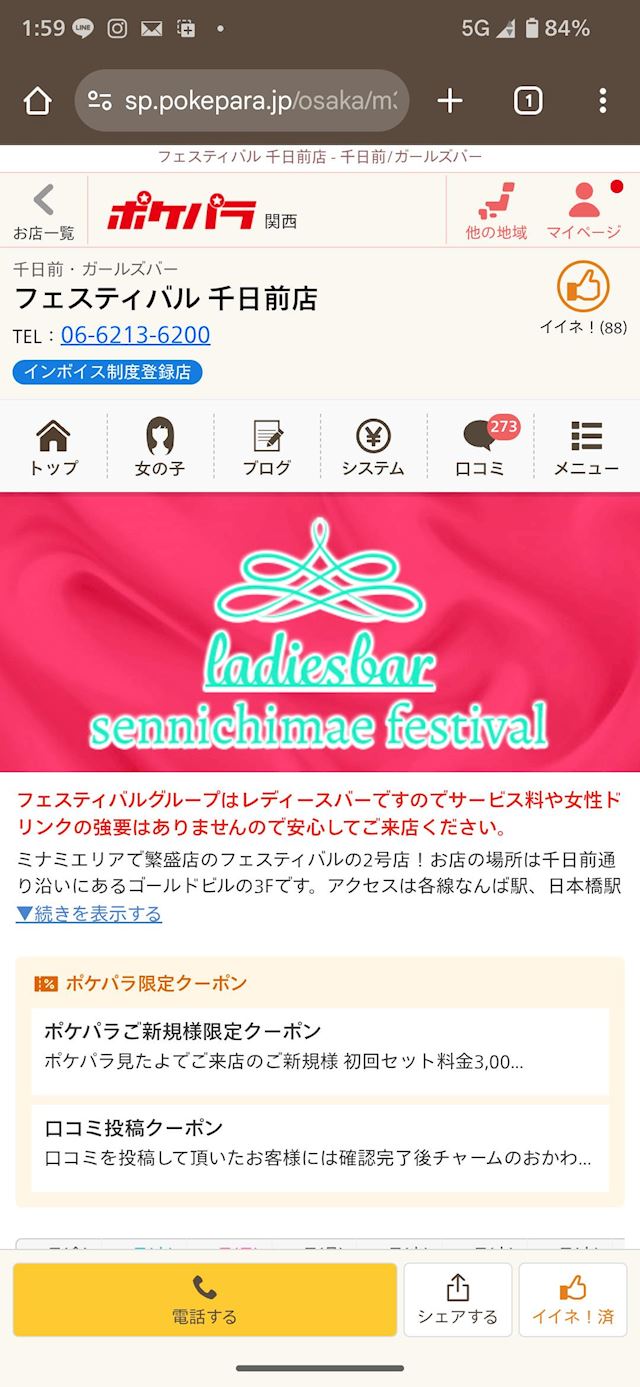 ポケパラで開いてるお店探してて、目に入ったんがフェスティバル千日前店で、毎回体験談にいいねくれる女の子もおったから、顔出しに行こうってことでお邪魔しました😊