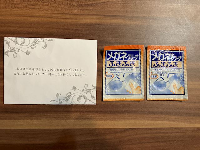 系列店ともども安心の料金、安定のサービス。卓上のメガネ拭き。お釣り入れてくれる封筒。