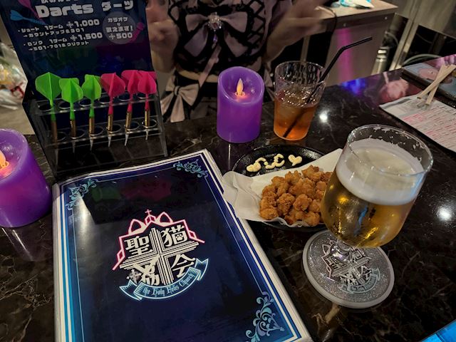 薄暗い店内は十字架やロウソクのネオンが光ってオシャレ。カラオケやダーツもある。